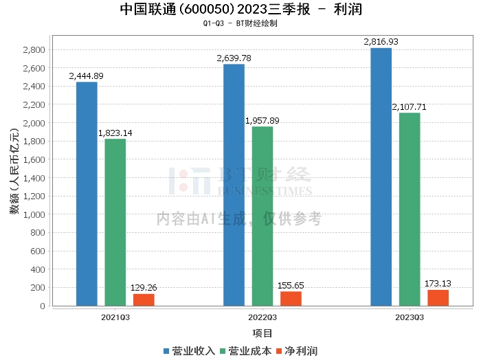 在利润方面,中国联通2023年三季度的营业收入为2816.93亿元,相比上年同期的2639.78亿元增长了6.7%。营业利润为211.18亿元,相比上年同期的189.47亿元增长了11.5%。营业成本为2107.71亿元,相比上年同期的1957.89亿元增长了7.6%。净利润为173.13亿元,相比上年同期的155.65亿元增长了11.2%。