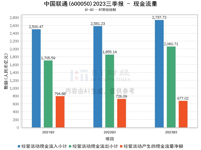 在现金流量方面,中国联通2023年三季度的经营活动产生的现金流量净额为677.02亿元,相比上年同期的726.09亿元减少了6.8%。经营活动现金流入小计为2737.72亿元,相比上年同期的2581.23亿元增长了6.1%。经营活动现金流出小计为2060.71亿元,相比上年同期的1855.14亿元增长了11.1%。