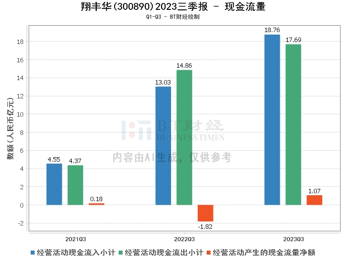 在现金流量方面,2023年三季度,翔丰华的经营活动产生的现金流量净额为1.07亿元,较上年同期的-1.82亿元大幅增长。这表明公司的现金流状况有所改善,经营活动的现金流入超过现金流出,公司的经营活动得到了现金的支持。