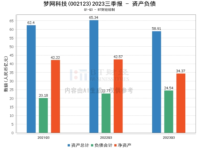 从财务数据来看,梦网科技2023年三季度的总资产为58.91亿元,相比上年度末的62.86亿元有所下滑,负债合计24.54亿元,相比上年度末的28.61亿元也有所减少。公司的净资产为34.37亿元,略高于上年度末的34.25亿元。资产负债率为41.66%,较上年度末的45.51%有所下降。这表明公司的负债水平在一定程度上得到了控制,整体财务状况相对稳定。