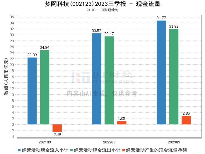 在现金流量方面,梦网科技2023年三季度的经营活动产生的现金流量净额为2.85亿元,相比上年同期的1.05亿元增长了172.00%。经营活动现金流入小计为34.77亿元,相比上年同期的30.52亿元有所增加。经营活动现金流出小计为31.92亿元,相比上年同期的29.47亿元也有所增加。这表明公司的经营活动现金流量总体上是健康的。