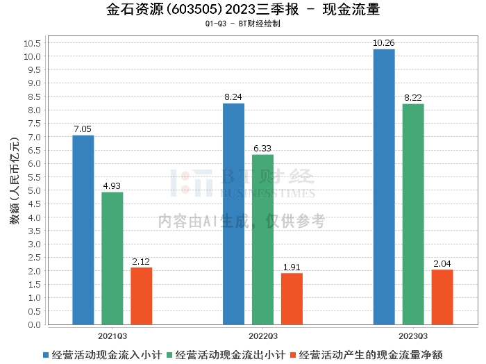 再次,从现金流量方面来看,金石资源2023年三季度的经营活动产生的现金流量净额为2.04亿元,相较于上年同期的1.91亿元有所增长。经营活动现金流入小计为10.26亿元,相较于上年同期的8.24亿元有所增长。经营活动现金流出小计为8.22亿元,相较于上年同期的6.33亿元有所增长。