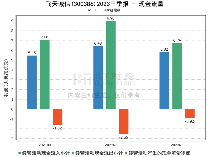 在现金流量方面,2023年三季度,飞天诚信的经营活动现金流入小计为5.82亿元,相比上年同期的6.43亿元减少了9.48%。经营活动现金流出小计为6.74亿元,相比上年同期的8.98亿元减少了24.94%。经营活动产生的现金流量净额为-9156.66万元,相比上年同期的-5567.47万元,净流出增加了64.18%。这些变化主要是由于软件退税及出口退税减少、本期智能终端产品备货减少等因素影响。