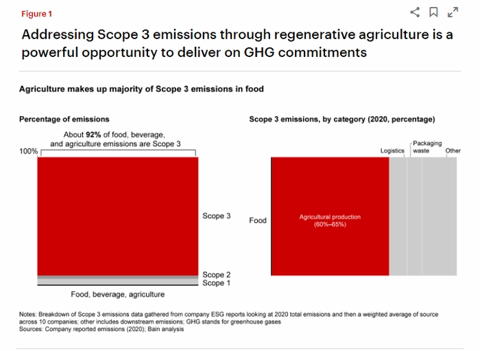 几乎所有的食品和农业公司在第三类减排方面都远远落后。农业生产贡献了这些排放的三分之二,这可以通过更可持续的农业实践大幅减少,例如农作物的再生农业(如下图)。但这些实践的采用率很低,除非相关公司能够解决规模问题,否则将无法实现承诺。最重要的是,农业公司将无法认识到自身的机会,即减少自身的气候影响,并在实现净零排放的道路上以及在水和生物多样性等其他领域发挥积极作用。