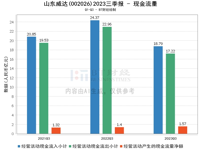 在现金流量方面,山东威达在2023年三季度的经营活动产生的现金流量净额为1.57亿元,相比上年同期的1.4亿元有所增长。这表明公司在经营活动中的现金流动情况较为稳健。