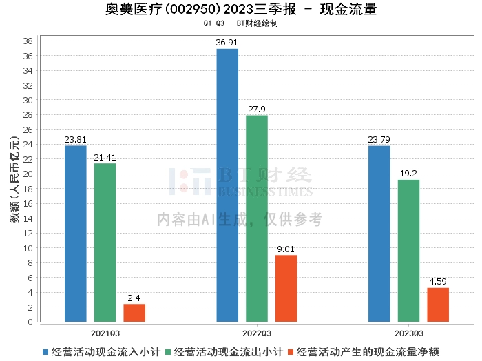 在现金流量方面,奥美医疗2023年三季度的经营活动产生的现金流量净额为4.59亿元,较上年同期的9.01亿元减少。经营活动现金流入小计为23.79亿元,较上年同期的36.91亿元减少。经营活动现金流出小计为19.2亿元,较上年同期的27.9亿元减少。