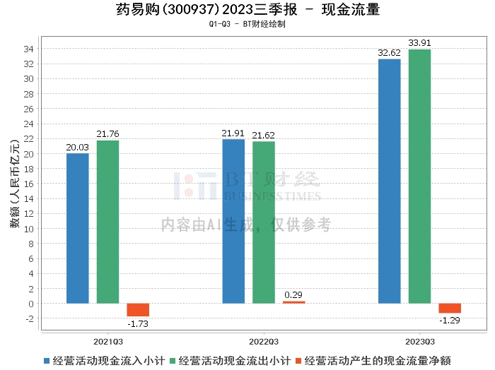 在现金流量方面,药易购2023年三季度的经营活动产生的现金流量净额为-1.29亿元,较上年同期的2897.85万元有所下降。经营活动现金流入小计为32.62亿元,较上年同期的21.91亿元有所增长。经营活动现金流出小计为33.91亿元,较上年同期的21.62亿元有所增长。这表明公司的现金流出较多,主要系开立银行保函冻结资金导致经营现金流出所致。