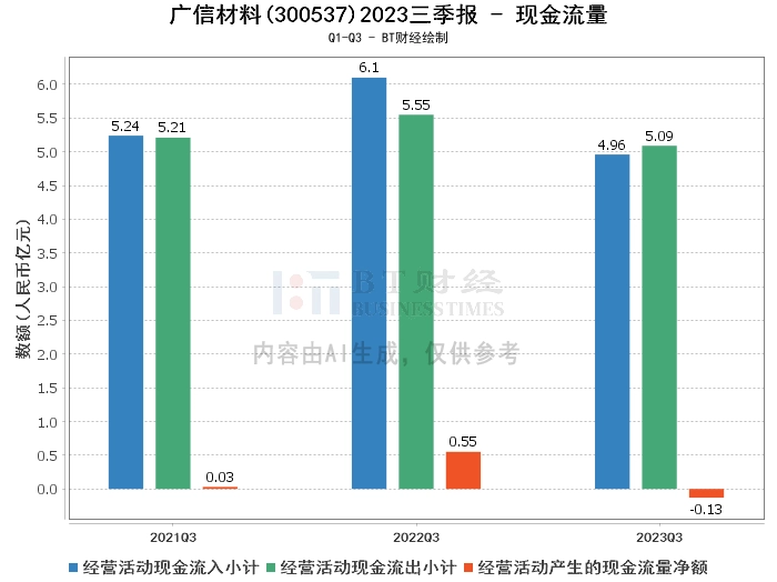 在现金流量方面,广信材料2023年三季度的经营活动产生的现金流量净额为-1349.39万元,与上年同期的5532.09万元相比,有所下降。经营活动现金流入小计为4.96亿元,较上年同期的6.1亿元有所减少。经营活动现金流出小计为5.09亿元,较上年同期的5.55亿元有所减少。财报数据摘要中提到,现金流量净额的变动主要是由于报告期内销售商品、提供劳务收到的现金减少以及支付的各项税费增加所致。