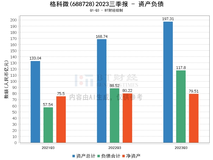 在资产负债方面,2023年三季度,格科微的总资产为197.31亿元,相较于上年度末的181.52亿元,增长了8.7%。负债合计为117.8亿元,相比上年度末的102.57亿元有所增加。公司净资产为79.51亿元,略高于上年度末的78.95亿元。资产负债率为59.7%,较上年度末的56.5%有所上升。