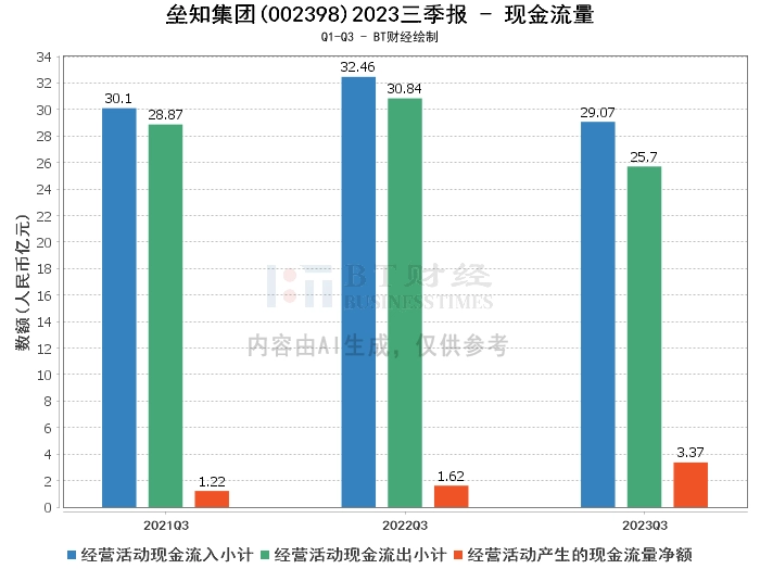 综上所述,垒知集团在2023年三季度的经营状况呈现出总资产增长,负债略有增加,净资产提升,营业收入和净利润下滑,但经营活动产生的现金流量净额大幅增加的情况。这表明公司在资产管理方面表现良好,但在利润方面存在一定的压力,不过其现金流量的大幅增加则显示出公司的经营活动具有较强的现金产生能力。