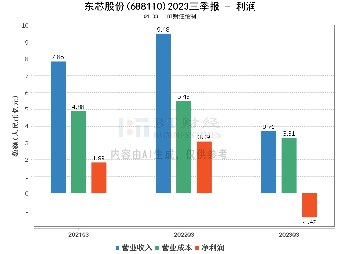 在利润方面,东芯股份2023年三季度的营业收入为3.71亿元,较上年同期的9.48亿元大幅下降。营业利润为-1.86亿元,较上年同期的3.37亿元转为亏损。营业成本为3.31亿元,较上年同期的5.48亿元有所减少。净利润为-1.42亿元,较上年同期的3.09亿元转为亏损。这主要系本期受市场景气度下降,产品市场价格下滑,营业收入较去年同期相比大幅下降。