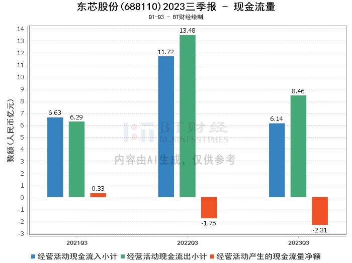 在现金流量方面,东芯股份2023年三季度的经营活动现金流入小计为6.14亿元,较上年同期的11.72亿元有所减少。经营活动现金流出小计为8.46亿元,较上年同期的13.48亿元有所减少。这主要系年初至报告期末营业收入大幅下降,收到的货款减少。