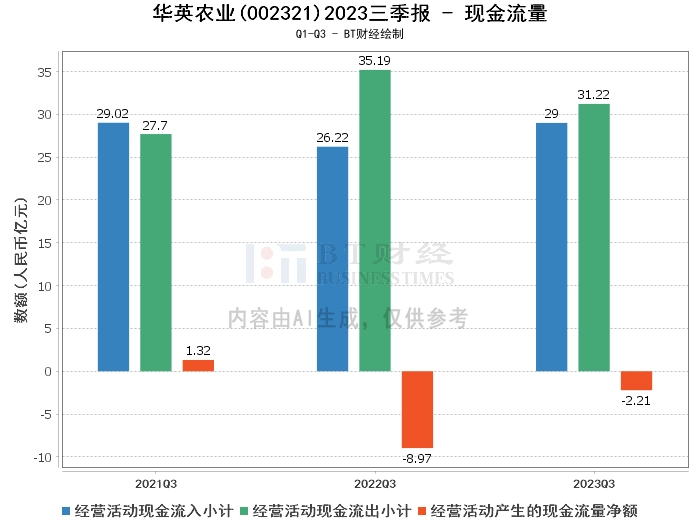 在现金流量方面,华英农业2023年三季度的经营活动现金流入小计为29亿元,相比上年同期的26.22亿元有所增长。经营活动现金流出小计为31.22亿元,相比上年同期的35.19亿元有所减少。