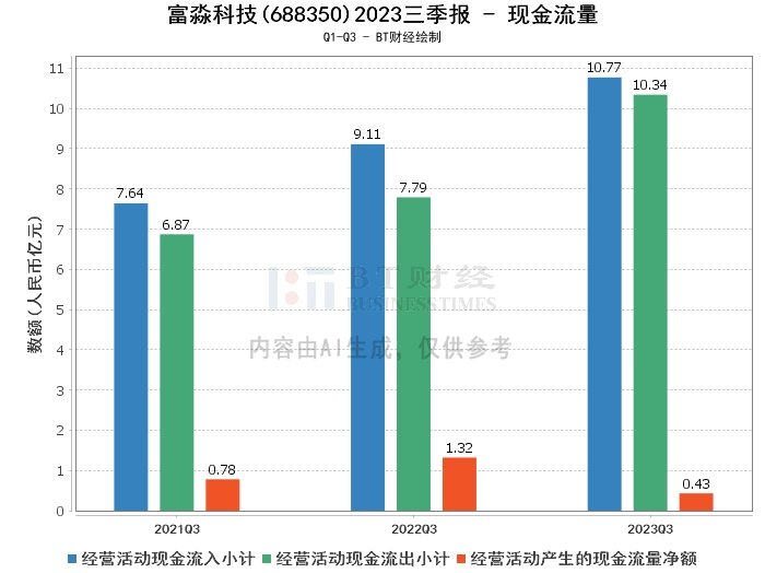 再次,从现金流量方面来看,富淼科技的经营活动产生的现金流量净额从上年同期的1.32亿元降至本报告期末的4277.37万元,经营活动现金流入小计从上年同期的9.11亿元增至本报告期末的10.77亿元,经营活动现金流出小计从上年同期的7.79亿元增至本报告期末的10.34亿元。这些数据显示,公司的经营活动产生的现金流量净额有所下降,经营活动现金流入和现金流出都有所增加。主要系购买商品、接受劳务支付的现金的增加超过销售商品、提供劳务收到的现金的增加,收到的税费返还减少以及支付给职工及为职工支付的现金增加所致。