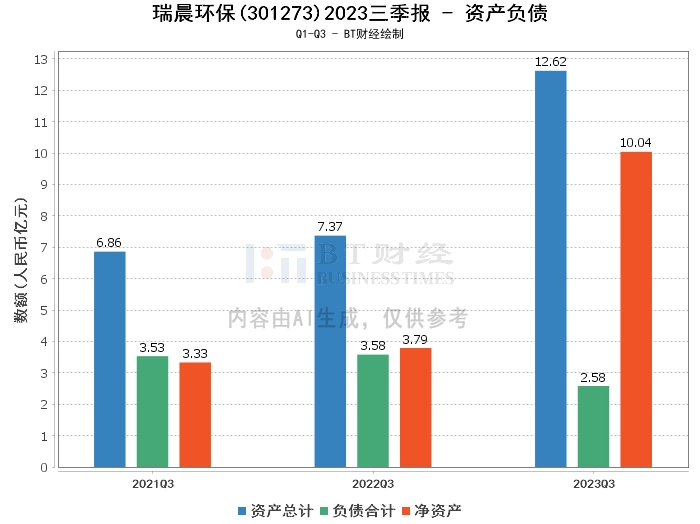 从资产负债方面来看,2023年三季度,瑞晨环保的总资产为12.62亿元,相较上年度末的12.72亿元有所下降。负债合计为2.58亿元,相较上年度末的2.83亿元减少。公司的净资产为10.04亿元,相较上年度末的9.89亿元有所增加。资产负债率为20.43%,相较上年度末的22.25%有所下降。