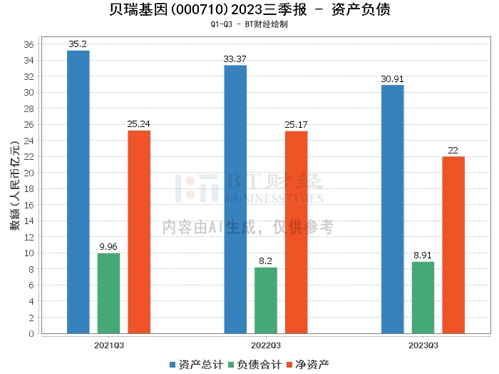 在资产负债方面,贝瑞基因2023年三季报显示,公司资产总计为30.91亿元,相比上年度末的32.01亿元有所下降。负债合计为8.91亿元,较上年度末的8.72亿元略有增加。净资产为22亿元,相比上年度末的23.29亿元有所减少。资产负债率为28.83%,较上年度末的27.23%有所上升。