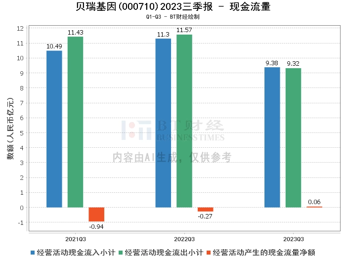 综上所述,贝瑞基因2023年三季度的经营状况整体较为困难,营业收入和净利润均出现了较大幅度的下滑,而现金流量净额虽然实现了正转负,但公司的经营压力依然较大。