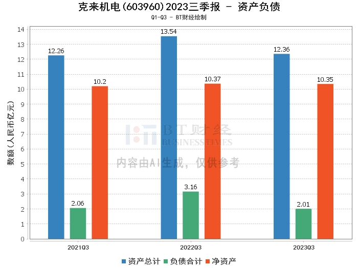 在资产负债方面,克来机电公司2023年三季度的资产总计为12.36亿元,相比上年度末的12.89亿元有所减少。负债合计为2.01亿元,相比上年度末的2.88亿元减少了。净资产为10.35亿元,相比上年度末的10.01亿元有所增加。资产负债率为16.27%,相比上年度末的22.36%有所下降。