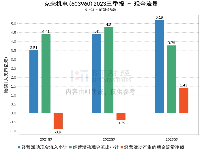 在现金流量方面,克来机电公司2023年三季度的经营活动产生的现金流量净额为1.41亿元,相比上年同期的-3914.2万元有显著提高。经营活动现金流入小计为5.19亿元,相比上年同期的4.41亿元有所增加。经营活动现金流出小计为3.78亿元,相比上年同期的4.8亿元有所减少。