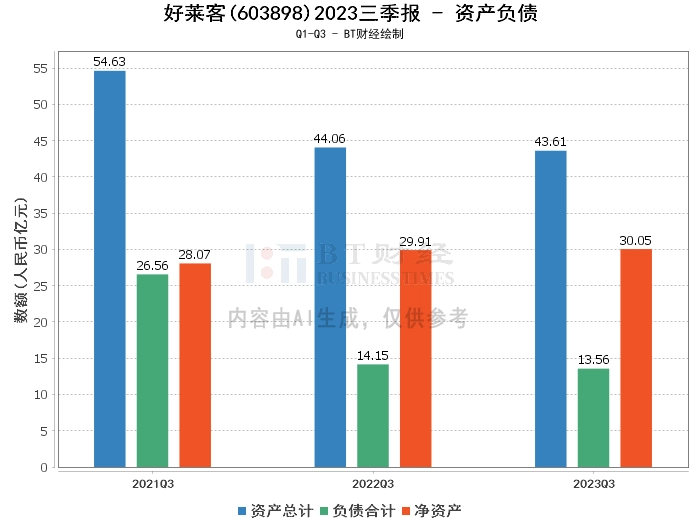 在资产负债方面,2023年三季度末,好莱客的总资产为43.61亿元,相比上年度末的43.81亿元略有下降。负债合计为13.56亿元,较上年度末的13.38亿元有所增加。净资产为30.05亿元,较上年度末的30.43亿元有所减少。资产负债率为31.09%,较上年度末的30.54%略有上升。