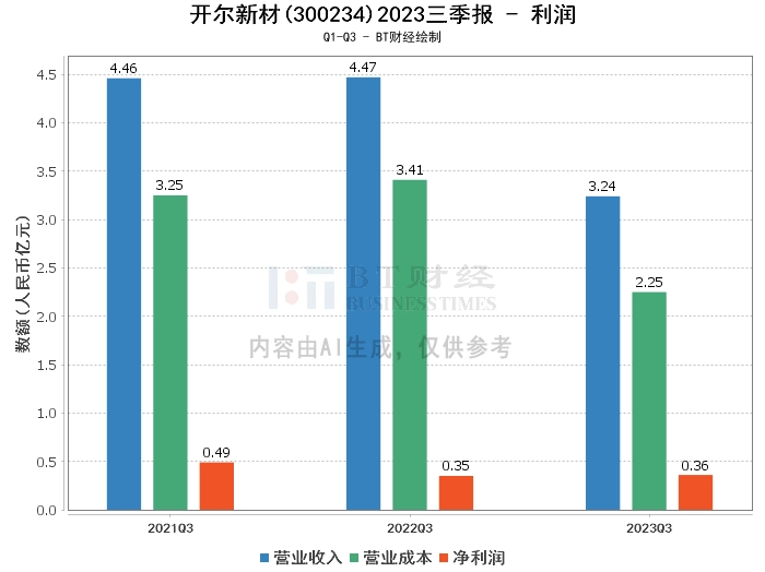 在利润方面,2023年三季度,开尔新材的营业收入为3.24亿元,较上年同期的4.47亿元有所下降。营业利润为4160.98万元,较上年同期的3508.77万元有所增长。营业成本为2.25亿元,较上年同期的3.41亿元有所下降。净利润为3621.43万元,较上年同期的3537.71万元有所增长。