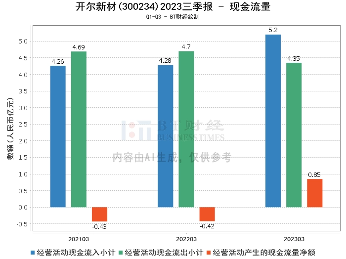 在现金流量方面,2023年三季度,开尔新材的经营活动产生的现金流量净额为8494.06万元,较上年同期的-4206.26万元有显著增长。经营活动现金流入小计为5.2亿元,较上年同期的4.28亿元有所增长。经营活动现金流出小计为4.35亿元,较上年同期的4.7亿元有所下降。