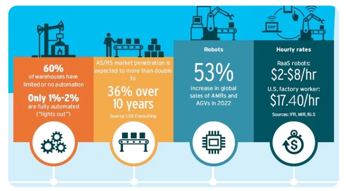 虽然全球72%的制造任务仍由人工完成,但机器人的使用正在增加,包括自动移动机器人(AMR)和自动导引车(AGV)。通过订阅机器人服务(RaaS)和3D打印等技术,可以实现更低的成本和更快的速度。虽然仓库大部分工作仍然是人工的,但自动化存储和检索系统的使用正在增加。