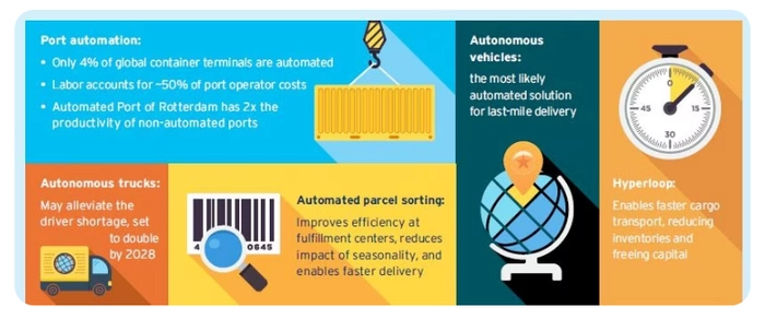 在全球范围内,集装箱码头的自动化程度仍然很低,尽管有证据表明,自动化可以提高码头的吞吐量和可靠性,同时降低成本。与此同时,其他技术,例如无人驾驶卡车、超级高铁运输、自动包裹分拣和最后一英里自动交付技术等,都可以提高物流效率。