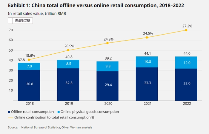 这一趋势最终的结果是,到2022年,中国在线实体商品的零售额已从2018年的约7万亿元人民币上升到12万亿元人民币,目前占中国零售消费总额的27%(如下图)。市场规模庞大,再加上创新的商业模式、高效的物流网络和社交互动带来的亲和力,巩固了中国作为全球电子商务重要枢纽的地位。