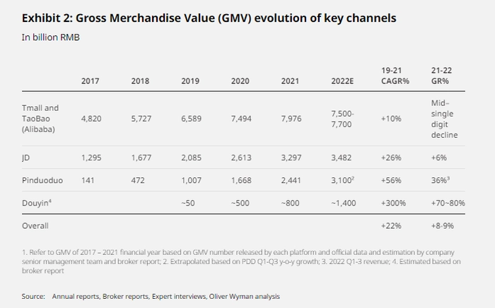 看看中国的发展,人们不难发现电子商务的格局正在发生变化。在社交商务兴起的推动下,阿里巴巴和京东这两大巨头长期以来在平台上的主导地位正日益受到挑战。在短时间内,随着挑战者拼多多、微信小程序和抖音(TikTok)的加入,“两大巨头”变成了“五大巨头”。