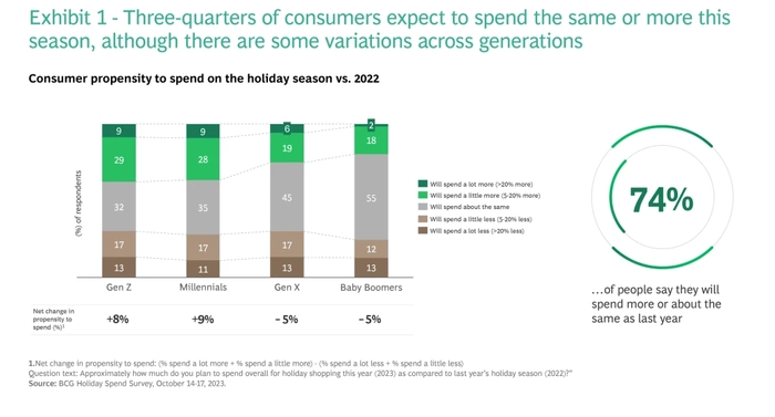 假日购物季不再是几个月之后,几周之后,或者几天之后。它已经到来了。波士顿咨询公司在2023年10月中旬对假日消费调查的最新数据进行了分析。