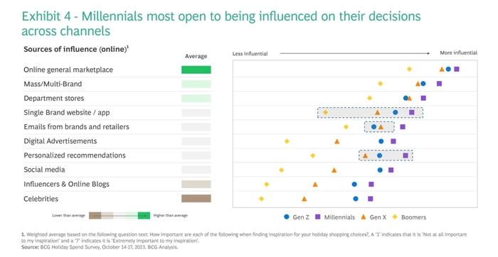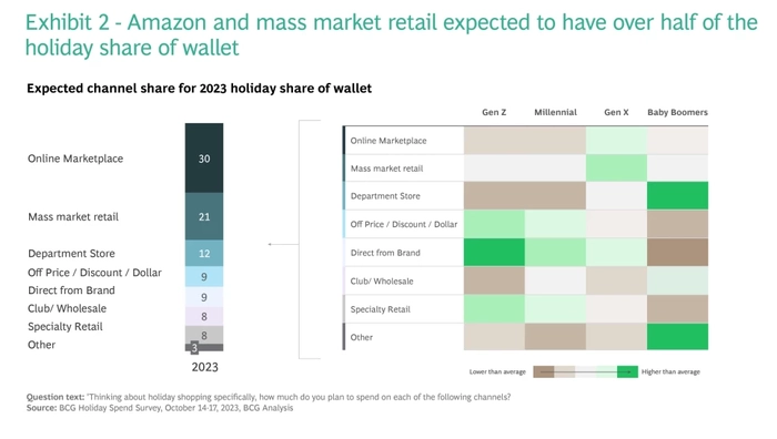 在渠道方面,亚马逊和大众市场零售商预计将占据消费者钱包份额的50%。Z世代和千禧一代则更有可能直接从品牌、特定零售店和折扣商处购买,而婴儿潮一代更喜欢去百货商店。波士顿咨询公司看到,这些趋势不仅仅局限于假日购物。
