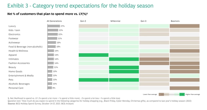 Z世代预计将在所有类别上花费更多,尤其是在服装和宠物上。同样,千禧一代还计划在儿童、美容和家居用品上花费更多。相比之下,预计X世代今年的支出增幅将低于年轻一代,但在奢侈品和健康保健这两个领域例外。婴儿潮一代预计,随着他们购买的产品减少,并寻找更多的优惠,这部分群体在大多数类别上的支出都会减少。