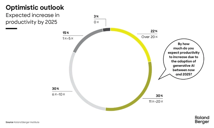 有趣的是,罗兰贝格认为,使用新的人工智能语言模型暂时不会导致一家公司的员工人数大幅减少。在接受相关调查的高管中,只有16%的受访者计划在2025年底前裁员5%甚至更多。大多数受访者认为员工人数不会有任何变化。当谈到预期的生产力提升时,情况正好相反:绝大多数受访者(82%)认为,从生成式人工智能中企业能够获得至少6%的效率提升,这是现实的。