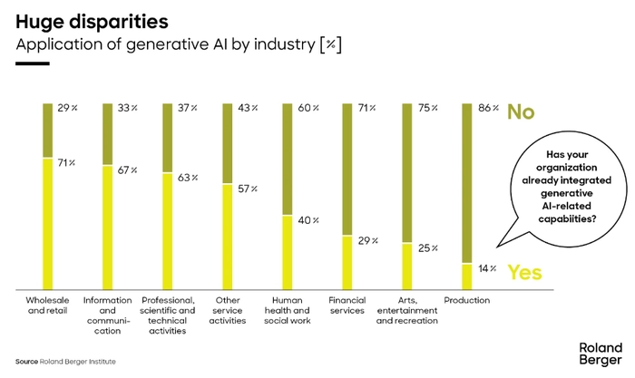 在罗兰贝格的排名中,使用新技术的领跑行业是批发和零售;信息和通信;专业、科学和技术活动以及其他服务活动。在所有这些行业中,至少57%的企业已经在其组织中部署了生成式人工智能相关工具。相比之下,在传统制造业中,目前只有14%的公司正在探索生成式人工智能的潜力。