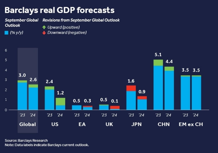 巴克莱研究的分析师预计,世界经济将在2024年放缓,但将以一种相当温和的方式放缓。主要经济体的失业率将达到较低的峰值,全球通胀将进一步下降。对于全球经济来说,这不是完全的软着陆(soft landing),但明显是软性的(soft-ish)着陆。