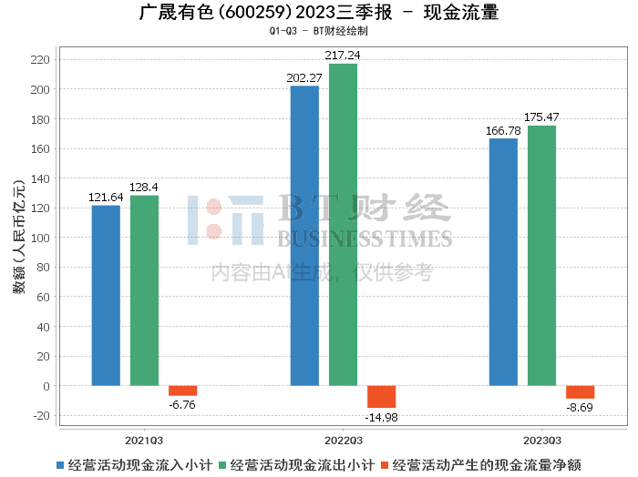 现金流量方面,广晟有色在报告期内经营活动产生的现金流量净额为负8.69亿元,主要是由于购买原料储备、产品等经营性资金占用减少所致。经营活动现金流入小计为166.78亿元,而现金流出小计为175.47亿元,表明公司在经营活动中的现金支出大于现金收入。