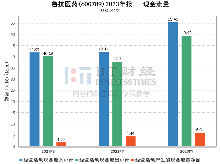 现金流量方面,鲁抗医药的经营活动产生的现金流量净额从上年同期的4.44亿元增加至6.04亿元,增长了35.92%,这一变化表明公司的经营活动更加高效,现金流状况更加健康。经营活动产生的现金流入总计为55.46亿元,而现金流出总计为49.42亿元,现金流入的增长速度超过了现金流出,进一步证明了公司经营效率的提高。