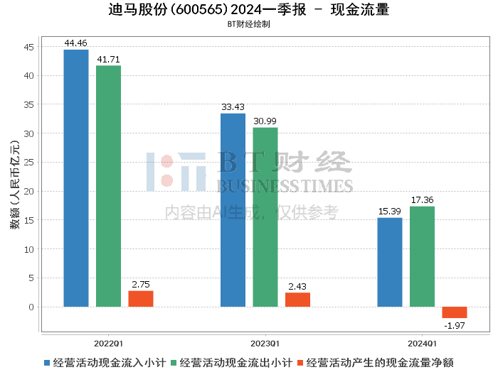 现金流量方面,迪马股份的经营活动产生的现金流量净额为-1.97亿元,同比下降180.94%。经营活动现金流入小计为15.39亿元,同比减少54.79%,而现金流出小计为17.36亿元,同比减少44.00%。这表明公司在经营活动中的现金流管理面临较大压力,尤其是地产板块签约及回款规模下降显著影响了现金流入。