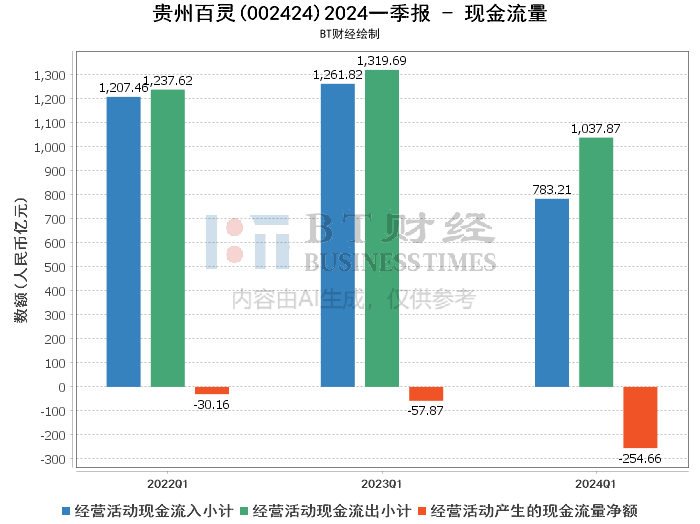 现金流量方面,贵州百灵在2024年一季度的经营活动产生的现金流量净额为-2.55亿元,同比大幅下降340.05%。这一变化主要由于销售商品、提供劳务收到的现金同比减少。投资活动产生的现金流量净额为-13.6百万元,同比下降176.37%,主要由于收到其他与投资活动有关的现金减少。筹资活动产生的现金流量净额为1.52亿元,同比大幅增加1073.89%,这表明公司在报告期内通过融资活动获得了更多的资金支持。