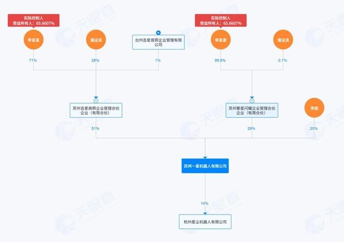 方宇没有点名说出后方是谁,从一星机器人的股权结构来看,这个后方或是吉利。一星机器人董事长潘运滨也是吉利半导体公司的CEO。吉利系人员在一星机器人中占据举足轻重的地位。天眼查的股权穿透图显示,一星机器人的实控人为李星星,持股比例65.66%,拥有51%的表决权。