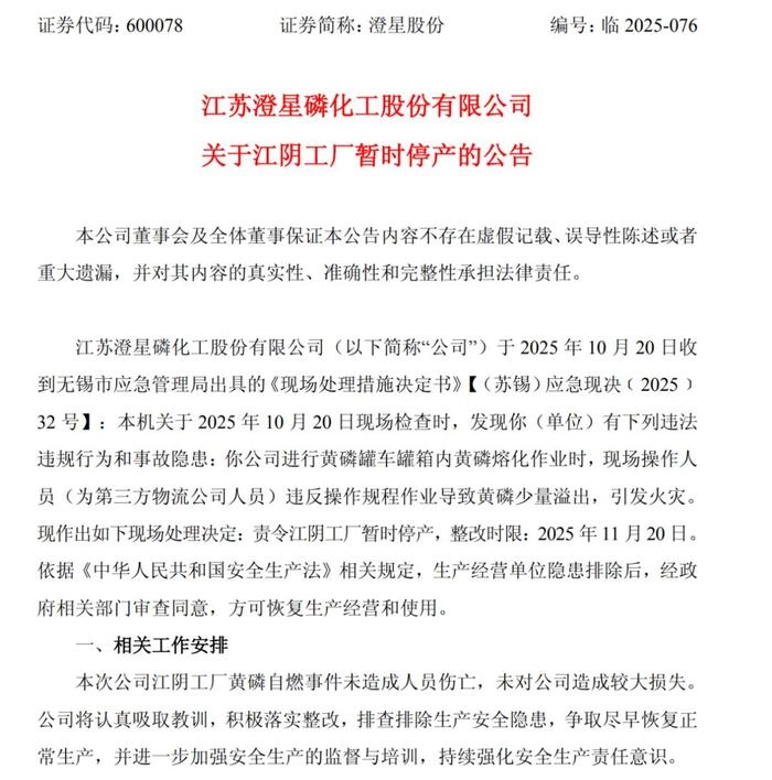 10月22日,澄星股份发布停产公告。原因是10月20日厂区突发黄磷自燃事故,幸好未造成人员伤亡。此次黄磷自燃事件并非澄星股份首次发生安全事故。2020年旗下子公司江阴澄星日化的磷酸钠盐车间就曾发生一起爆炸事故,导致1人受伤。这次安全事故的停产对于刚刚摆脱亏损困境的澄星股份的声誉和市场信心带来一定的损伤,股价随即下跌9.48%。
