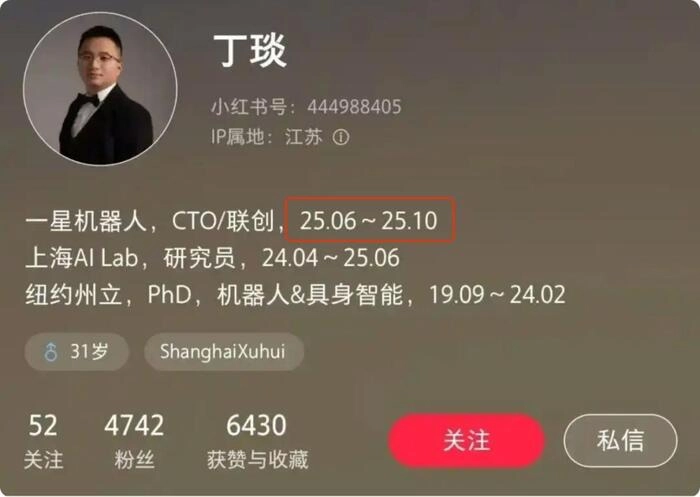 一星机器人原本阵容豪华,上海AI Lab明星研究员丁琰,复旦大学姜育刚教授团队、清华大学汪玉教授团队以及国际知名的FastUMI数据采集团队都被招至麾下。在“不差钱”又背靠吉利这棵大树的情况下,一星机器人的解散完全超乎市场想象,一星机器人CTO兼联合创始人丁琰的社交平台却证实了解散一事并非空穴来风。丁琰个人小红书账号关于一星机器人的履历介绍也很明确标注为2025年6月至2025年10月,时间上完全对得上。