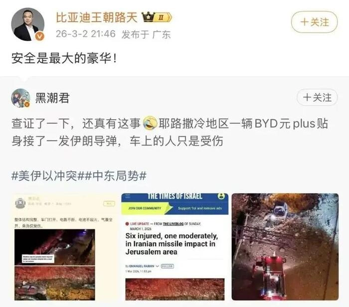 伊朗的一枚导弹直接给比亚迪做了一次价值上亿美元的全球性活广告。3月1日,一枚伊朗导弹砸在耶路撒冷周边,威力大到路面炸出大坑,周边车辆非废即燃,交通牌被掀飞数米。在距离爆炸的极近的位置,一辆比亚迪元PLUS(海外版ATTO 3)格外醒目,爆炸后,这辆车外观千疮百孔、车窗全碎、车体严重变形。