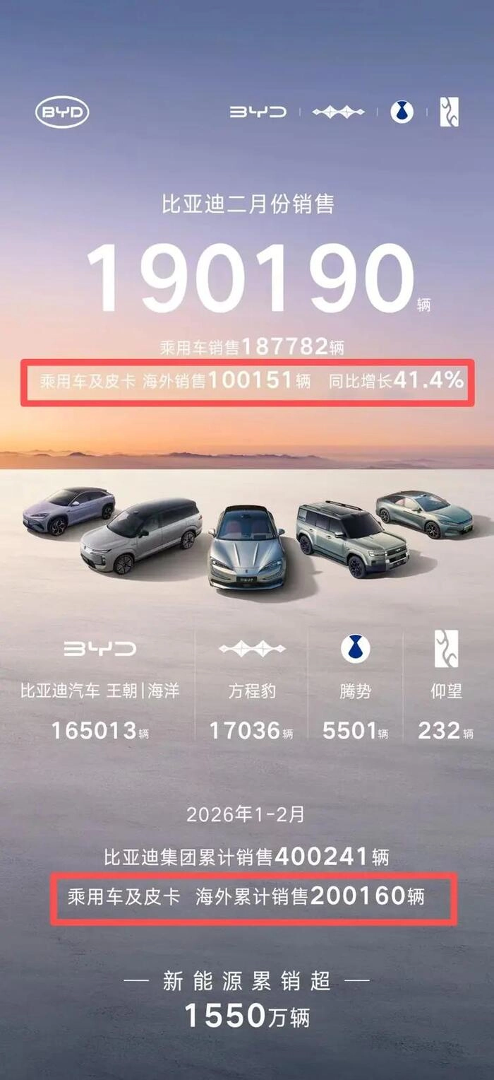 进入2026年,比亚迪在海外市场月均销量超10万辆,增幅都在40%以上。今年2月海外单月销量超10万辆,首次超过国内销量,全球化进入新阶段。目前比亚迪已经完成产能布局,泰国、巴西、乌兹别克斯坦和匈牙利的海外总产能达75万辆。同时比亚迪也完成了从“卖车”到“综合能源服务商”的战略升级,同步输出电池、光伏、储能等技术,打造生态壁垒。