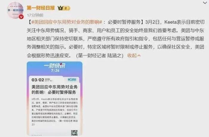 另一个中国企业的身影是Keeta(美团海外版),还上了央视新闻。因为中东战火纷飞,很多中东的平民连日常生活都成了问题,在中东受到战火影响的地区,美团海外版竟然还在交战地带送餐,让全球颇为震惊。网友也不禁感慨:“看到空袭所在区域的外卖小哥,绷不住了。”也有人说,比战地记者还硬核的,是战地外卖员。随后美团回应称:“密切关注中东局势,必要时,特定区域将暂时限制或停止服务。”