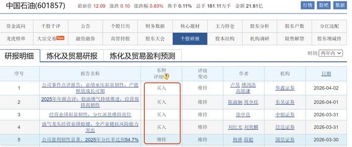华鑫证券、东吴证券、中银证券等多家机构,对中国石油评级均为"买入"或"增持"。