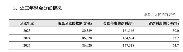 对比近三年:2023年805亿元(派息率50%)、2024年860亿元(52.2%)、2025年860亿元(54.7%)。