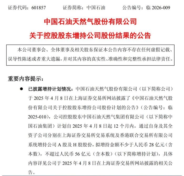 控股股东增持公告(来源:中国石油2026年4月公告)