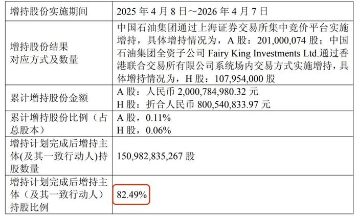 据中国石油2026年4月7日公告,中国石油集团及全资子公司在2025年4月8日至2026年4月7日期间,累计增持公司股票约3.09亿股(占总股本0.17%),增持总金额约28.01亿元人民币,增持后持股比例升至82.49%。